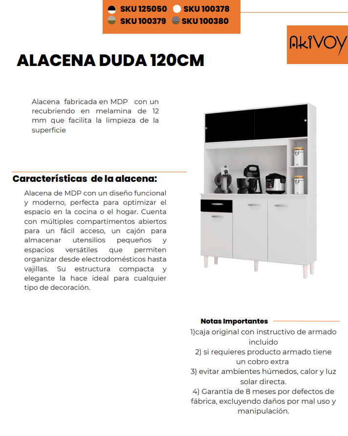 Esta alacena está fabricada en MDP de 15 mm con recubrimiento en pintura UV, lo que garantiza una mayor resistencia y un acabado elegante que facilita la limpieza diaria. Su diseño moderno y sobrio en color castaño es ideal para la cocina, comedor o zona de ropas, adaptándose perfectamente a cualquier espacio.