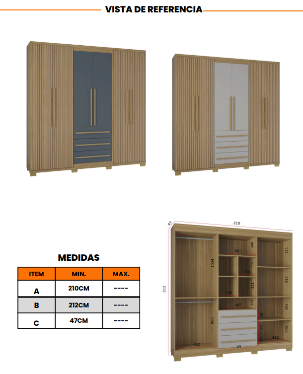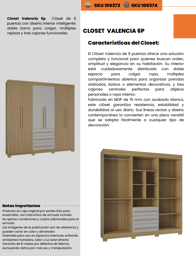 Este closet cuenta con seis puertas amplias, que esconden un interior inteligentemente distribuido para maximizar el orden. Incluye doble espacio para colgar ropa larga y corta, ideal para vestidos, camisas y pantalones. Además, múltiples compartimientos abiertos permiten organizar prendas dobladas, bolsos y accesorios, manteniendo todo al alcance y perfectamente visible.