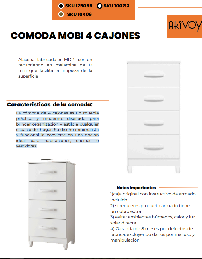 Cómoda Mobi 4 Cajones Blanco: organización y estilo en tu espacio