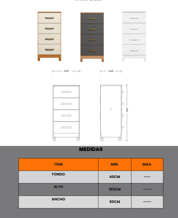 Fabricada con materiales de alta calidad, esta cómoda ofrece resistencia y durabilidad para el uso diario. Sus cuatro cajones amplios permiten almacenar ropa, documentos o accesorios de forma ordenada y accesible.