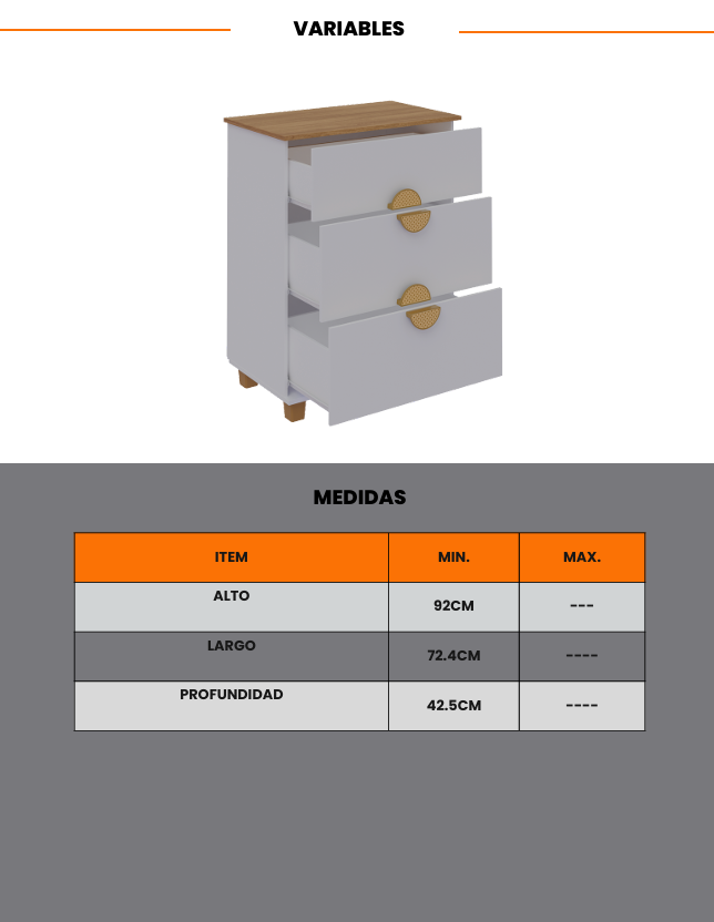 Con dimensiones pensadas para optimizar espacios, esta cómoda es la solución ideal para quienes buscan funcionalidad y elegancia en un solo producto.