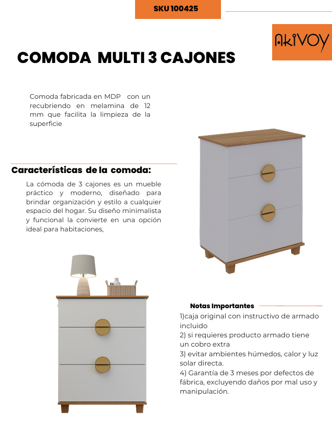 Organiza con estilo y transforma tus ambientes con la Cómoda Multi 3 Cajones Blanco / Rustic Premium.