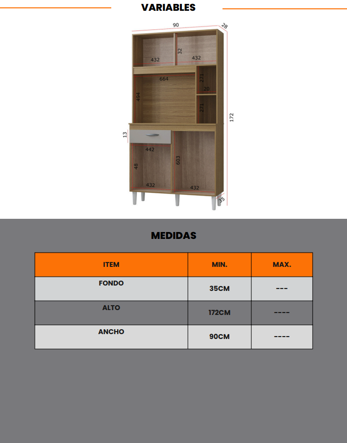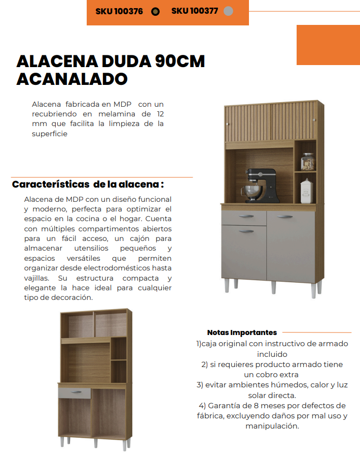 Fabricada en MDP de 15 mm con recubrimiento UV, esta alacena garantiza durabilidad y un acabado moderno que resiste el uso diario. Su diseño funcional incluye 1 cajón, 2 gavetas y 2 puertas corredizas, facilitando el acceso a tus utensilios sin ocupar espacio extra en la cocina.
