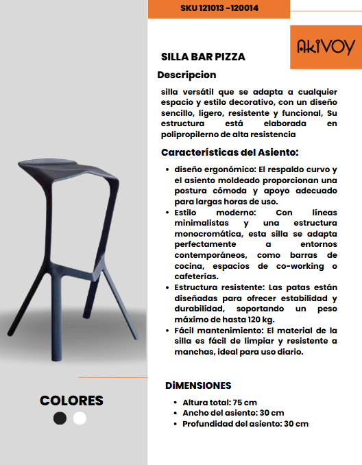 Esta silla para bar destaca por su diseño moderno y minimalista, ideal para ambientes contemporáneos en hogares, restaurantes o bares. Fabricada en polipropileno reforzado e inyectado en color negro, garantiza resistencia y durabilidad.