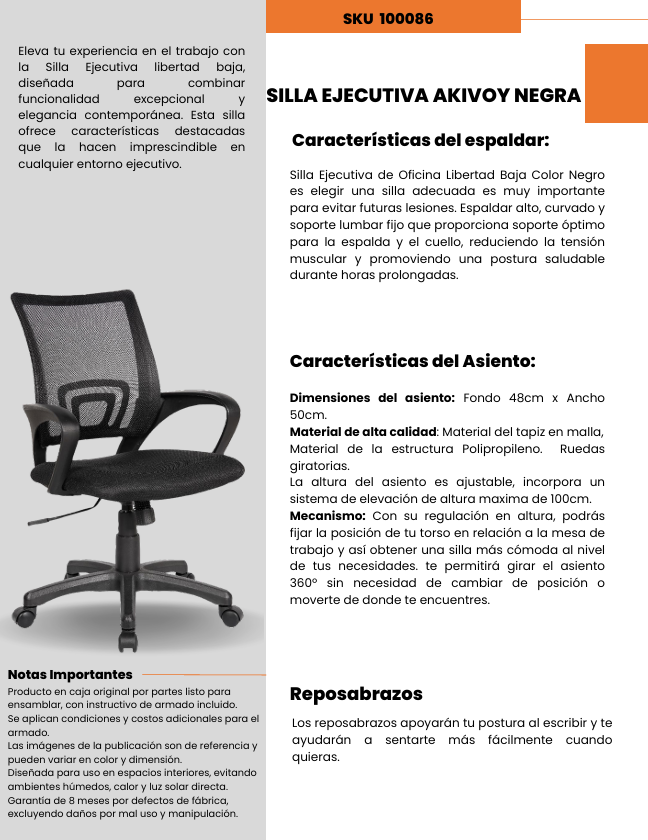 Ideal para espacios interiores, la Silla Ejecutiva Akivo debe mantenerse alejada de ambientes húmedos, calor o luz solar directa para preservar su calidad y durabilidad. Ofrece una garantía de 8 meses contra defectos de fábrica, excluyendo daños por mal uso.