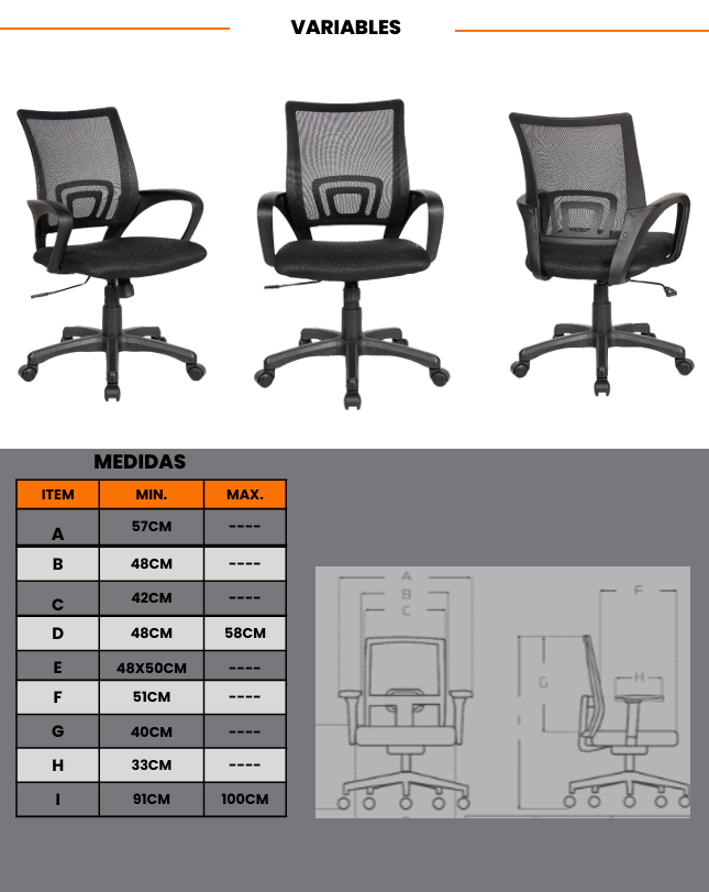 Nota: Las imágenes son referenciales y pueden variar en color y dimensiones. Optimiza tu espacio de trabajo con esta silla práctica y resistente, hecha para acompañarte con estilo y ergonomía.