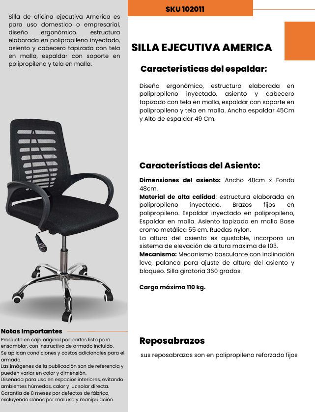 Opta por la Silla Ejecutiva América, una mezcla perfecta de funcionalidad, ergonomía y diseño moderno con base cromada para un ambiente laboral profesional y cómodo.