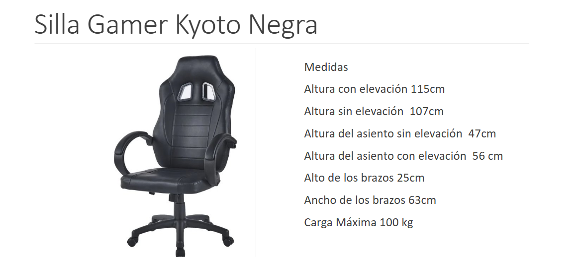 Su estructura incluye una base en polipropileno reforzado de color negro, acompañada de llantas de nylon que garantizan movilidad fluida y durabilidad. Los reposabrazos fijos están acolchados y tapizados en color negro, ofreciendo un soporte cómodo durante largas sesiones de juego.