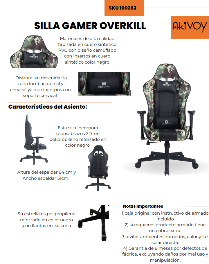 Incluye doble palanca para altura y respaldo, además de brazos en polipropileno regulables. La Silla Gamer Overkill es sinónimo de resistencia, confort y diseño ergonómico para mejorar tu experiencia de juego.