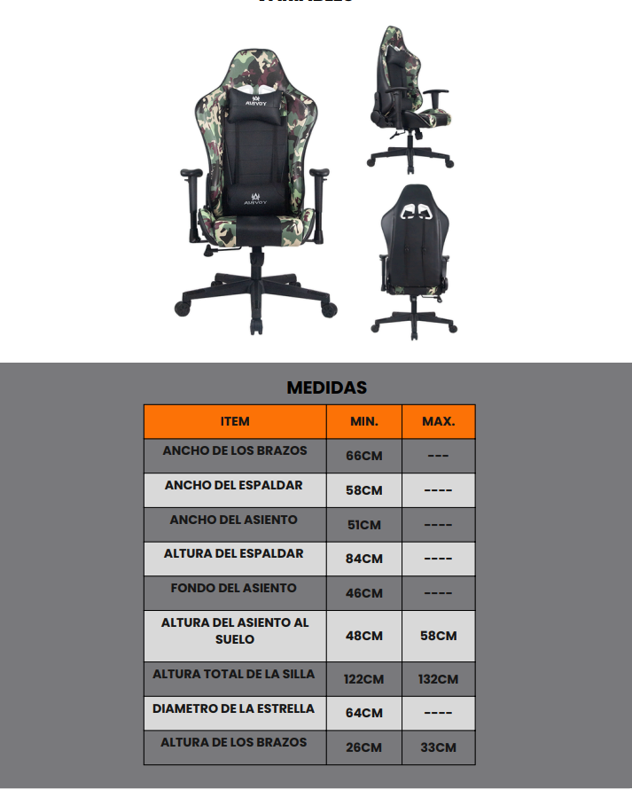 Esta silla está tapizada en cuero sintético PUV de alta resistencia en color negro con detalles en camuflado, con espuma de alta densidad que cuida tus zonas lumbares, dorsales y cervicales. El asiento firme aumenta la comodidad, mientras sus brazos regulables en altura y base reforzada con ruedas de nylon facilitan la movilidad.