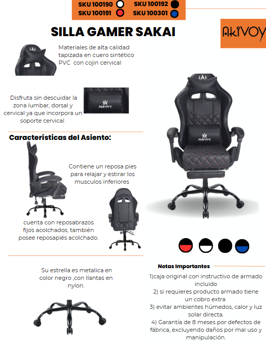 Descubre la Silla Gamer Sakai Roja, diseñada con cuero sintético PVC negro y detalles en rojo, perfecta para gamers y profesionales. Su estructura incluye reposabrazos fijos y acolchados, además de un reposapiés que garantiza descanso total.