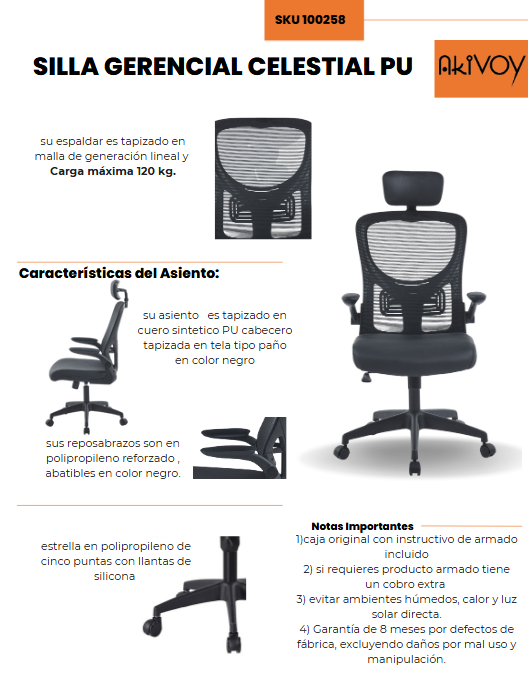Descubre la Silla Gerencial Celestial PU, diseñada para quienes valoran la calidad, funcionalidad y confort en su espacio de trabajo. Su estructura en polipropileno garantiza durabilidad, mientras que el respaldo en malla lineal ofrece ventilación y soporte ergonómico durante largas jornadas.