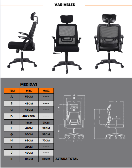 Características principales: - Espaldar y asiento en malla transpirable - Cabecero ajustable y apoya brazos en polipropileno - Base metálica cromada con ruedas de nylon - Mecanismo basculante con bloqueo e inclinación leve - Altura ajustable para adaptarse a tus necesidades