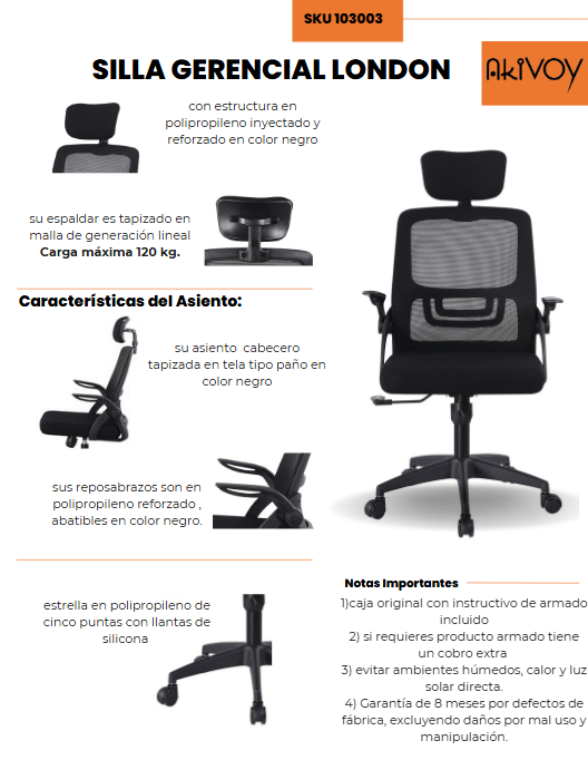 La Silla Gerencial London es la opción ideal para espacios domésticos y empresariales que buscan combinar estilo moderno con funcionalidad. Su diseño deportivo y estructura en polipropileno inyectado garantizan resistencia y durabilidad.