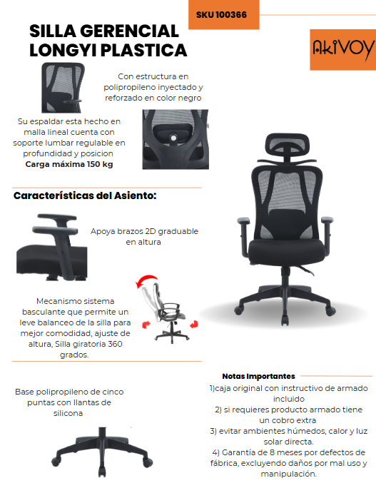 Silla Gerencial Longyi Base Plástica: confort y diseño ergonómico para tu oficina