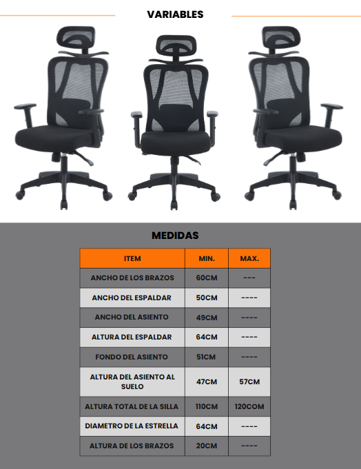 Con dimensiones ideales (Alto: 110 cm, Ancho: 49 cm, Fondo: 51 cm) y capacidad para soportar hasta 130 kg, esta silla giratoria 360° es perfecta para ambientes ejecutivos.